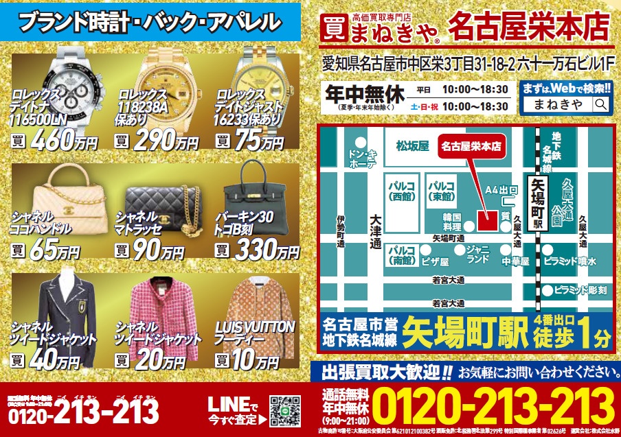 ロレックス、シャネル、エルメスといった人気のハイブランドの買取も、業界トップクラスの買取価格をお約束いたします。 なお高価買取専門店まねきやは、名古屋栄本店がございます。