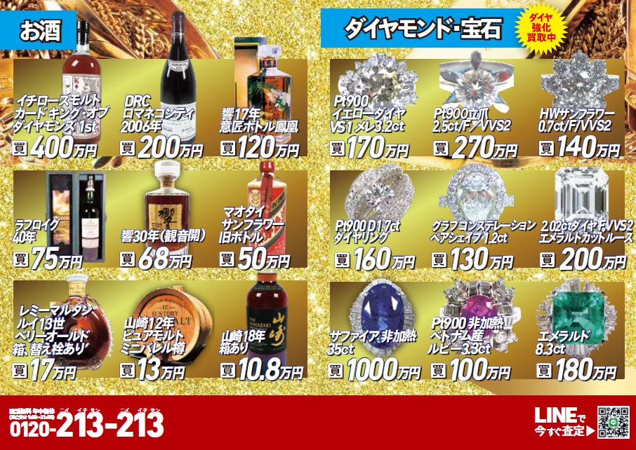 また、山崎や響などの国産ウィスキー、ラフロイグやレミーマルタンなどの人気の洋酒などもお売りください。