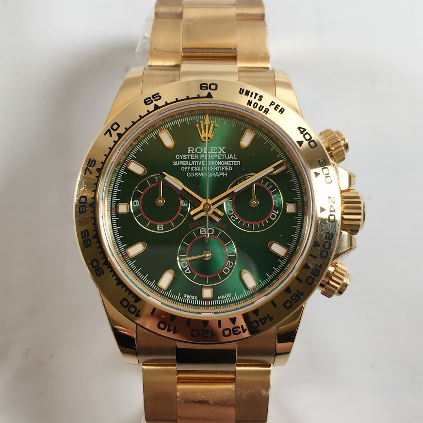 40mmの自動巻きで100mまでの防水です、このデイトナはロレックス唯一のクロノグラフ搭載のモデルですので圧倒的に需要が高くとても高額になります。クロノグラフというのはストップウォッチの役割を果たす機能で時間の計測が可能なためスポーツをしている方からの需要も圧倒的に高くなっています🐼✨実用性が高いところがこのデイトナが人気の理由です!さらに深さ100mまでの防水なので安心ですね😊さらにまだ人気の理由があります!それは暗い場所でも時間が確認しやすくなっているところです、デイトナの秒針やメモリにはクロマライト塗装というロレックスが独自に開発して特許を取得した夜光塗料が施されているため暗いところでは目盛りが青色に光り暗い場所でも時間の確認が可能です😳👏実用性が高くおしゃれさとリッチさを兼ねそろえたデザインに心惹かれます⌚🌟